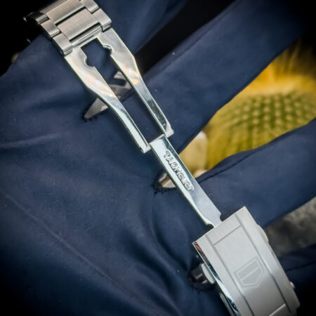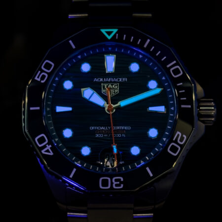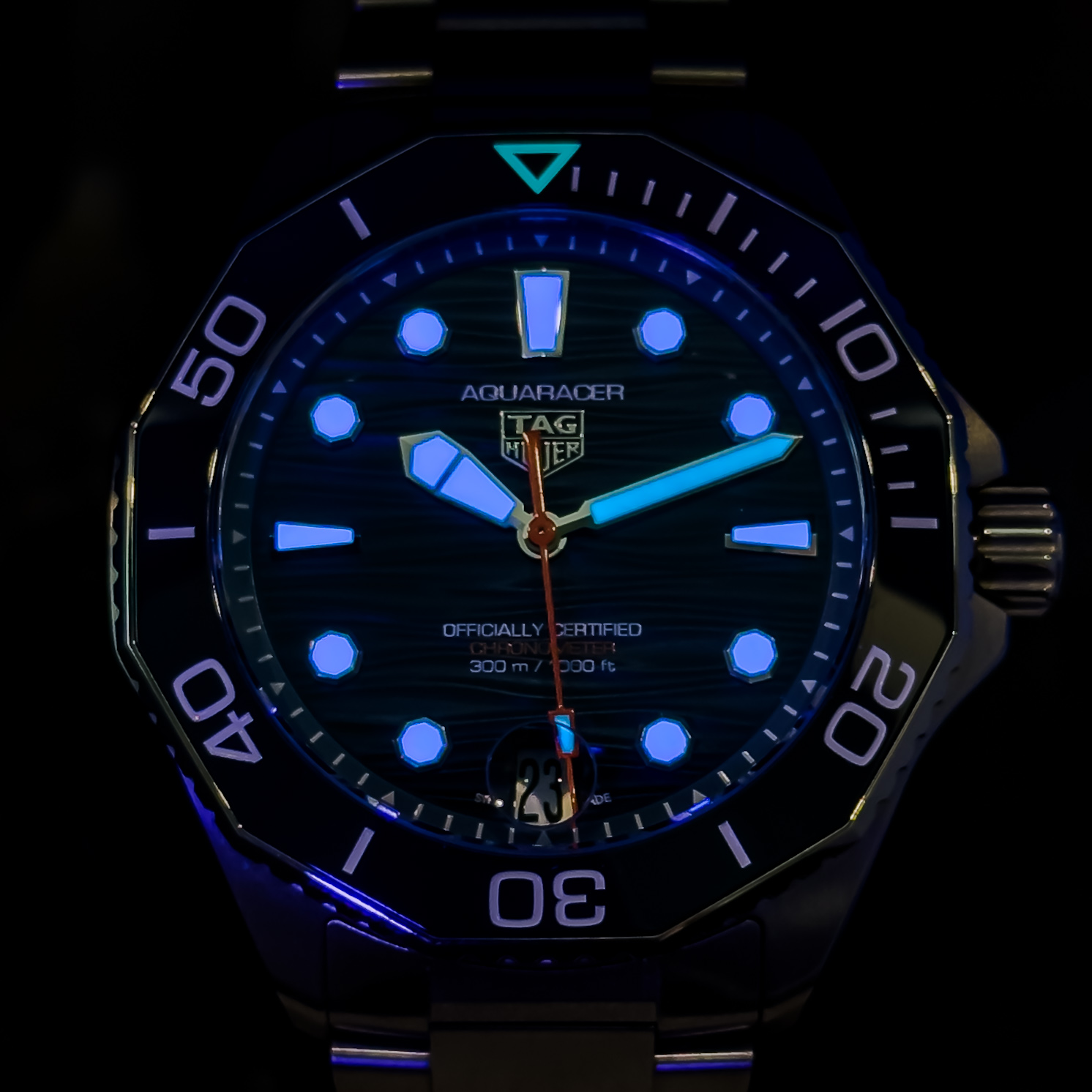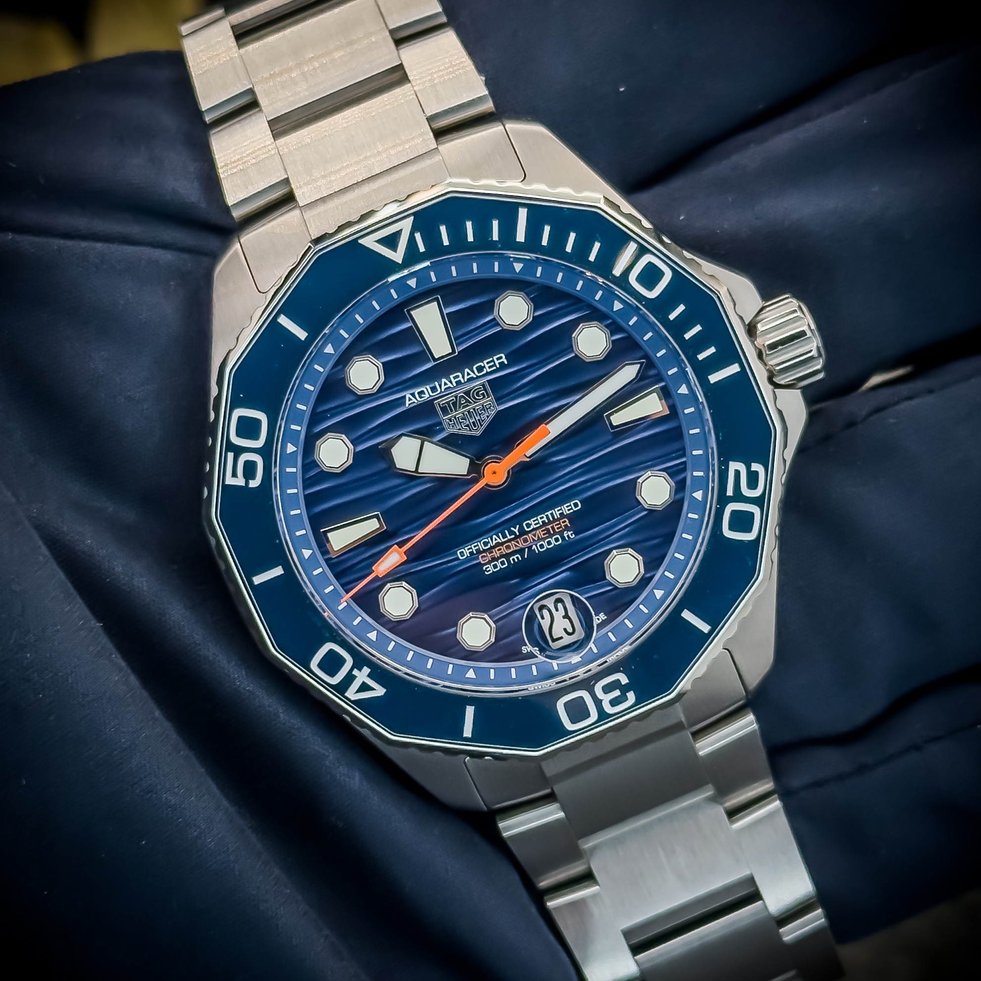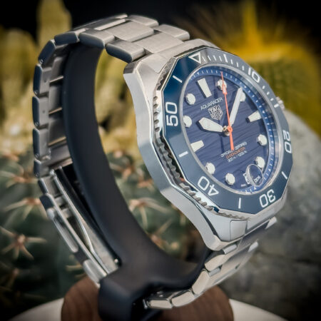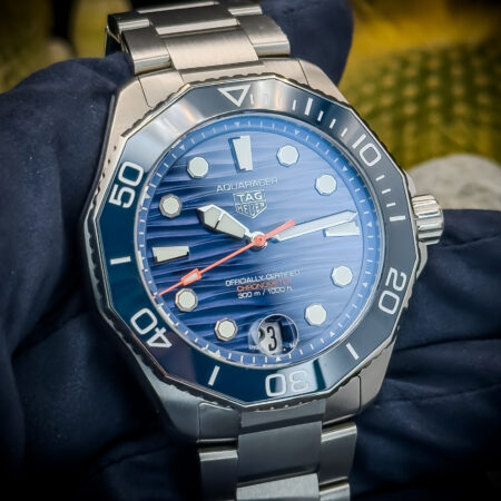 The Aquaracer Professional 300 WBP5111.BA0013 is TAG Heuer’s modern dive watch distilled to its cleanest form. This dated variant features a striking wavy blue dial, perfectly matched with a deep blue ceramic bezel. The 42mm stainless steel case wears comfortably thanks to its slim 12mm profile and refined lugs. It’s a sleek, ocean-ready tool watch with everyday wearability and premium build quality.