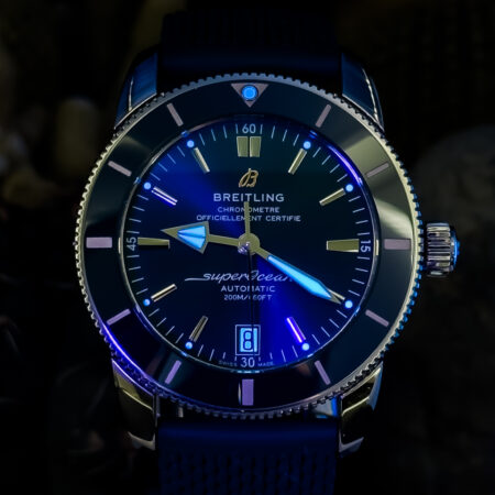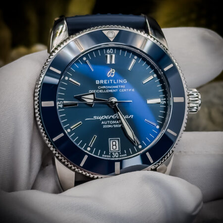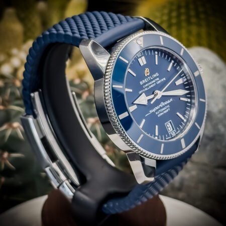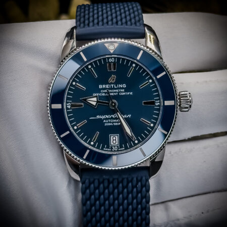 A modern tribute to the classic dive watches of the 1950s, this BTG Superocean Heritage B20 combines vintage aesthetics with contemporary performance. The 42mm stainless steel case houses a striking blue dial, complemented by a matching ceramic bezel and blue rubber strap. Powered by the reliable B20 automatic movement, this timepiece offers both style and substance for the discerning collector.
