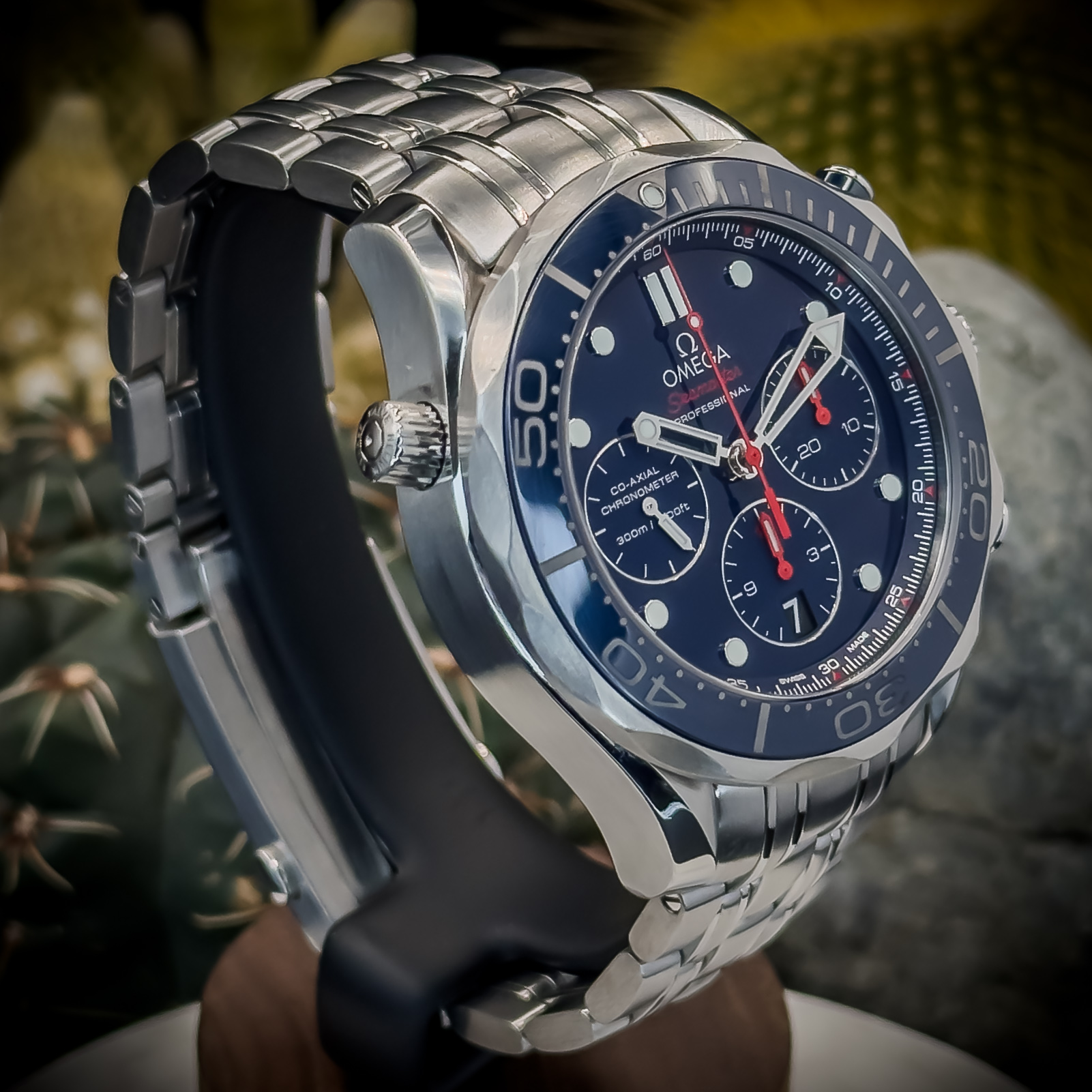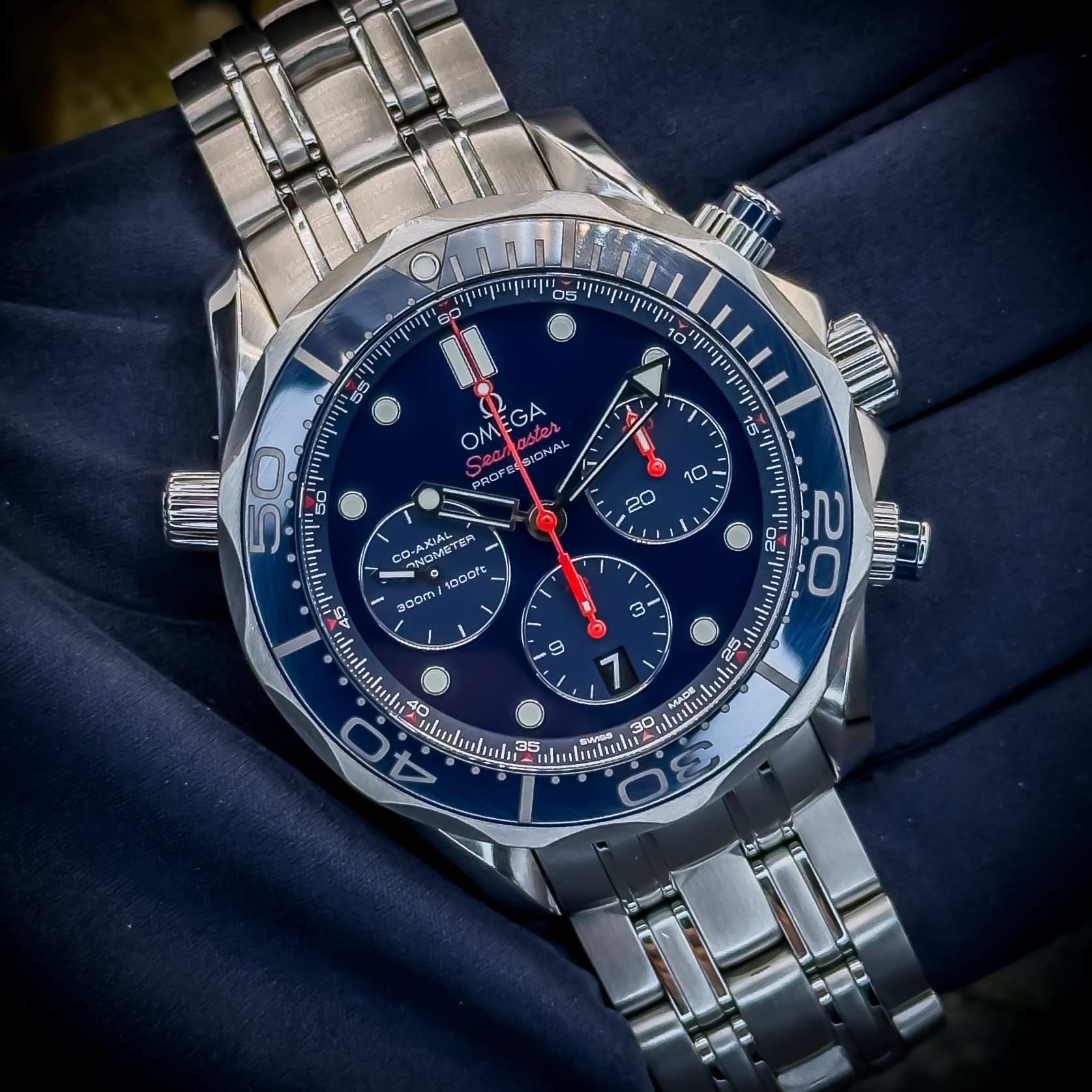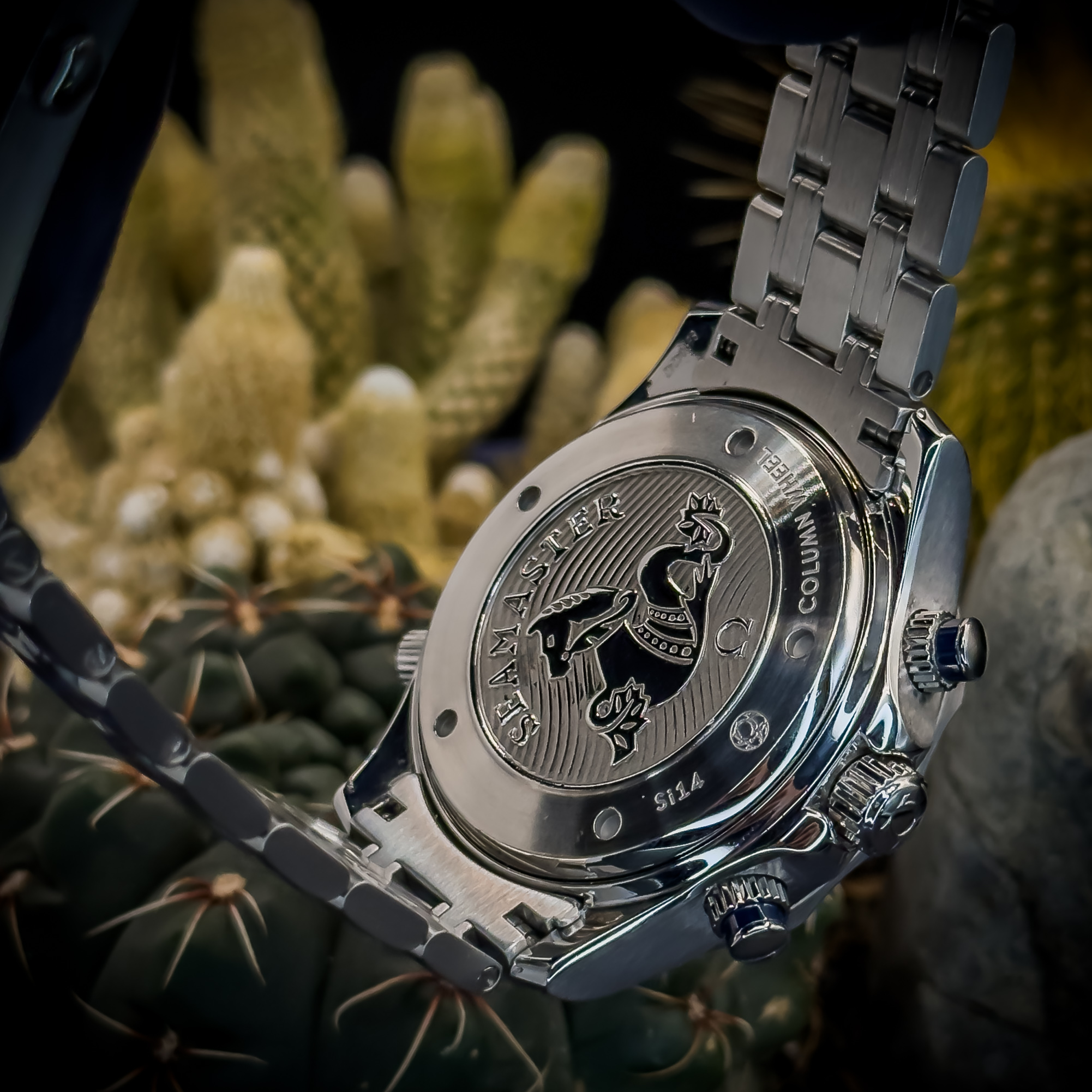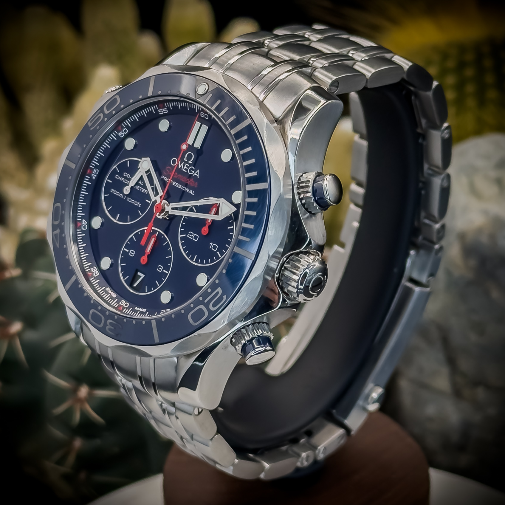 44mm | Stainless Steel Bracelet | Omega Caliber 1164 Automatic Chronograph | 44-Hour Power Reserve | Blue Wave Dial | Sapphire Crystal | Ceramic Bezel | Helium Escape Valve | Screw-Down Pushers | 300m Water Resistance