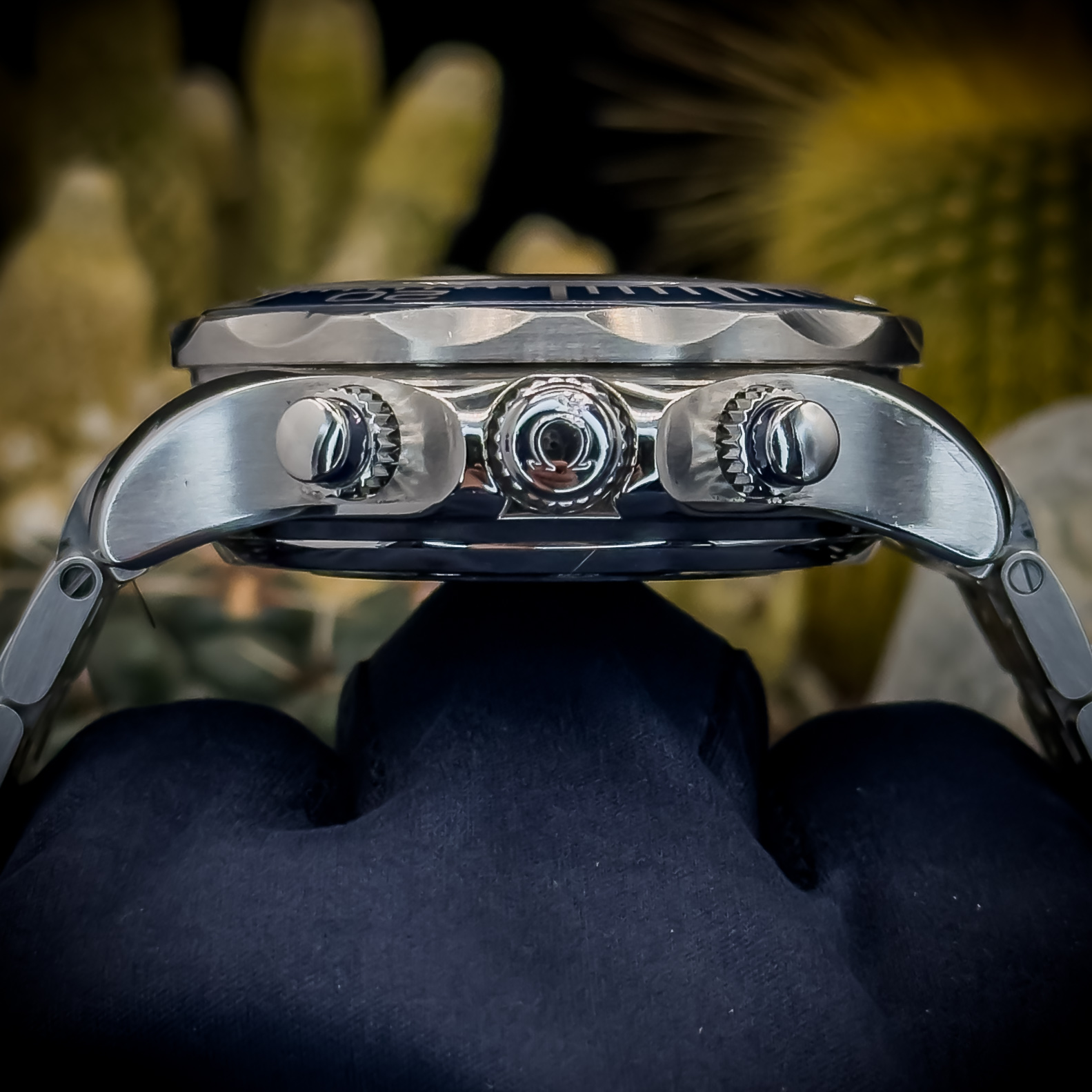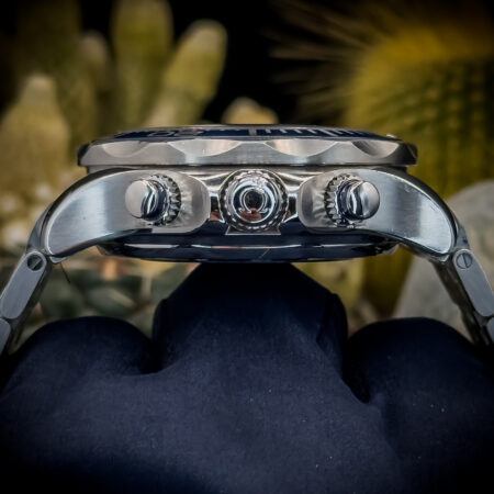 Very Good Pre-Owned Condition – This watch is freshly polished and ready for retail. Chronograph, pushers, and date function operate flawlessly. Timegrapher shows excellent working condition. A couple small nicks on the case only visible up with close inspection.
