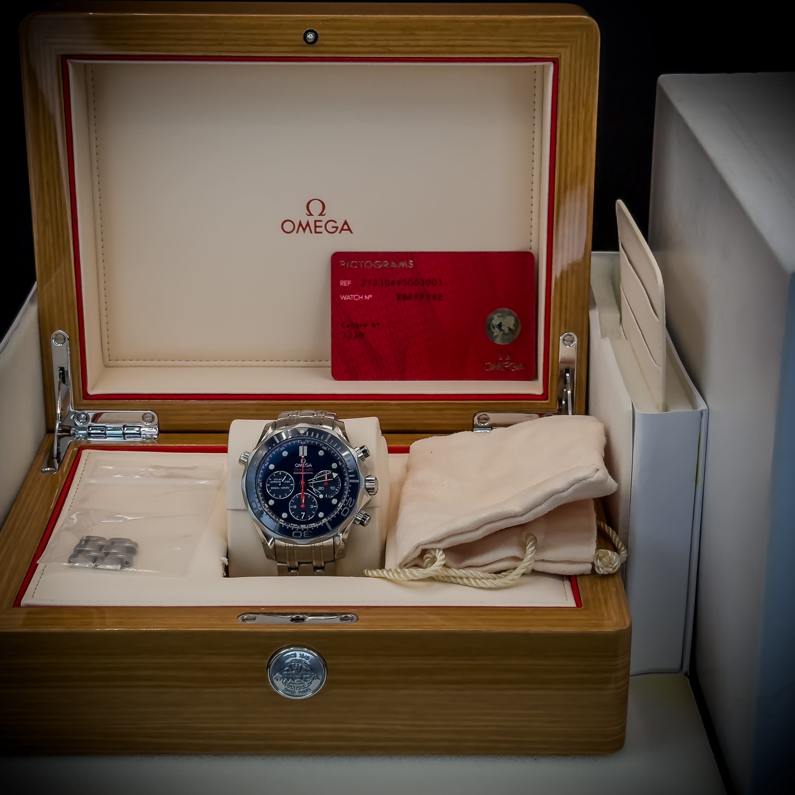 A classic from Omega’s professional diver collection, the Seamaster 300M Chronograph ref. 212.30.44.50.03.001 combines rugged utility with iconic styling. The 44mm stainless steel case wears bold but balanced, paired with a ceramic dive bezel and that unmistakable blue wave dial. This piece features red accents, broad sword hands, and Omega’s caliber 1164—based on the ultra-reliable Valjoux 7750—for chronograph functionality and everyday dependability. Offered here as a complete set, it’s an ideal choice for collectors or first-time buyers looking for a versatile sport chronograph with pedigree.